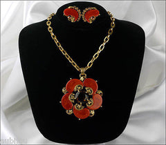 Vintage marked Art floral motif pendant and clip on earrings; antiqued gold tone metal; rusty color bakelite inserts; smoked topaz color rhinestones. -